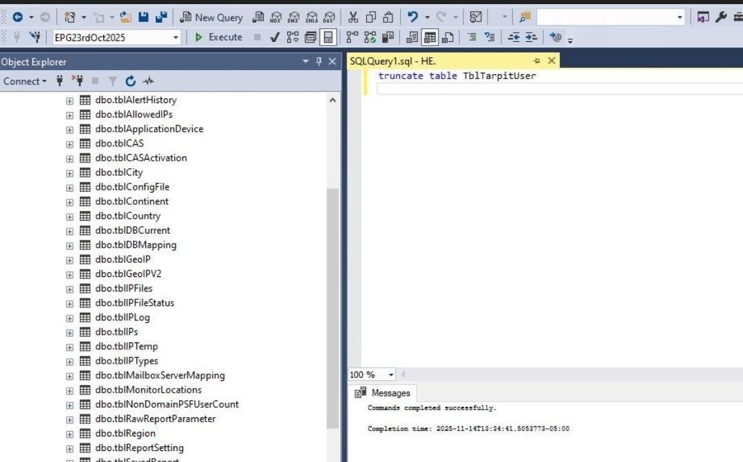 In the query window, run the following command to clear all entries from the Tarpit table: